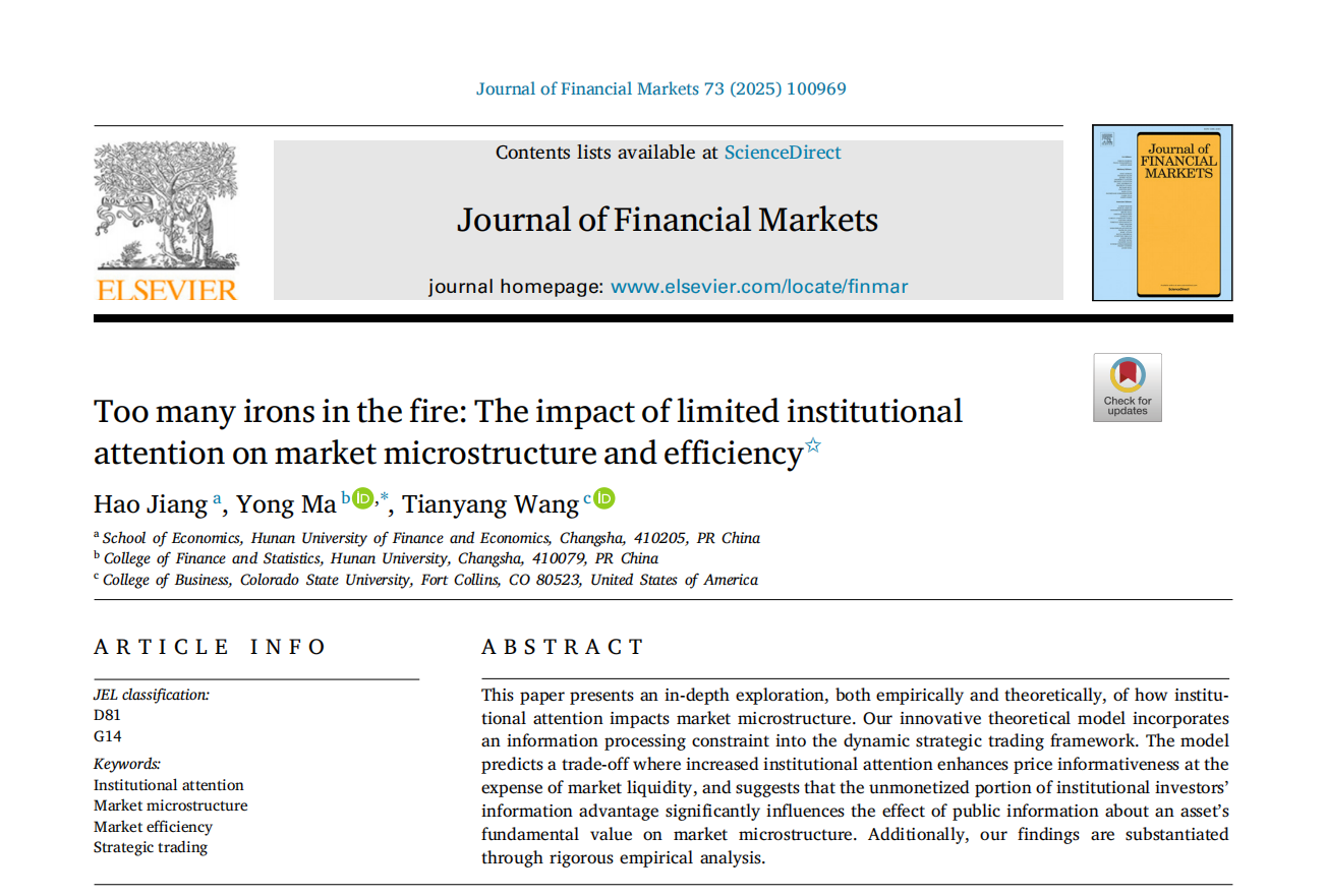 近日,海角 马勇教授与湖南财政经济学院江灏博士(海角 2023届博士毕业生)、科罗拉多州立大学王天阳教授合作的学术论文“Too many irons in the fire: the impact of limited institutional attention on market microstructure and efficiency”在金融学国际权威期刊Journal of Financial Markets,Volume 73, March 2025发表。