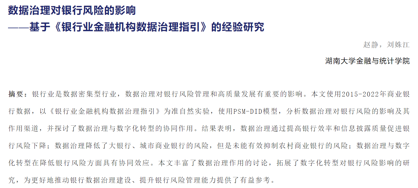 近日,海角 应用金融系赵静副教授和2022级硕士研究生刘姝江合作的题为“数据治理对银行风险的影响——基于《银行业金融机构数据治理指引》的经验研究”的论文发表在《金融研究》2025年第2期。
