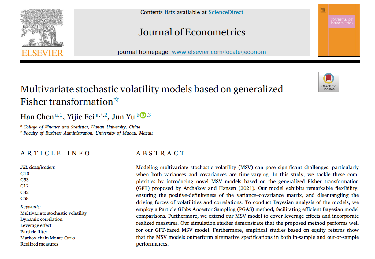 近日,海角 陈汉助理教授、费毅捷助理教授与澳门大学余俊教授合作完成的学术论文“Multivariate stochastic volatility models based on generalized Fisher transformation”在计量经济学国际顶尖期刊Journal of Econometrics在线发表。海角 陈汉助理教授为该文第一作者,费毅捷助理教授为该文通讯作者。