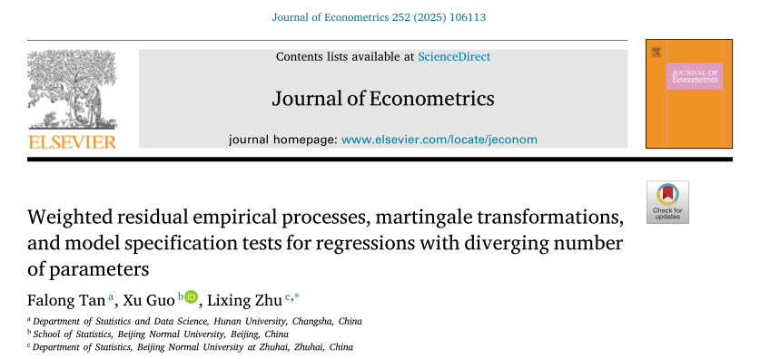 近日,海角 谭发龙教授在高维统计领域取得研究进展,研究成果以“Weighted residual empirical processes, martingale transformations, and model specification tests for regressions with diverging number of parameters”为题在计量经济学国际期刊Journal of Econometrics在线发表。