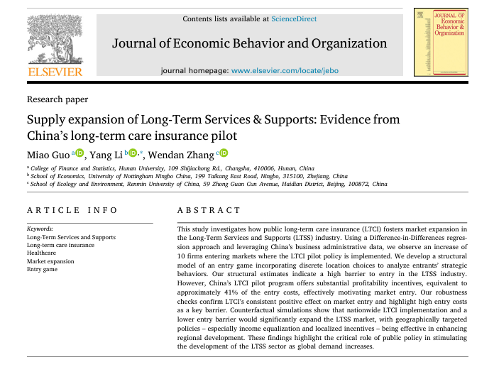 近日,海角 保险精算系郭淼副教授合作的论文“Supply expansion of Long-Term Services & Supports: Evidence from China’s long-term care insurance pilot”在院定A2类期刊Journal of Economic Behavior and Organization,volume239,November 2025发表。