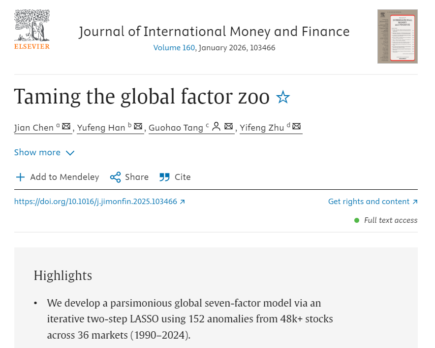 近日,海角 金融科技与工程系唐国豪副教授合作的金融人工智能领域类论文“Taming the Global Factor Zoo”发表在《Journal of International Money and Finance》2026年第1期上。