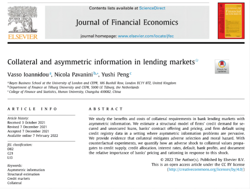 学院助理教授彭雨诗在国际顶级金融学期刊《Journal of Financial Economics》刊发合作论文“Collateral and Asymmetric Information in Lending Markets”,研究了抵押品在信息不对称的银行信贷市场中的作用。该论文由彭雨诗与伦敦大学城市学院贝叶斯商学院Vasso Ioannidou教授、蒂尔堡大学经济与管理学院Nicola Pavanini副教授合作撰写。