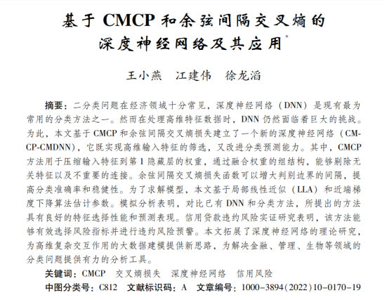 近日,海角 统计系王小燕副教授,和2021级博士研究生冮建伟、2021级硕士研究生徐龙滔合作的题为“基于CMCP和余弦间隔交叉熵的深度神经网络及其应用”的论文发表在《数量经济技术经济研究》2022年第10期。