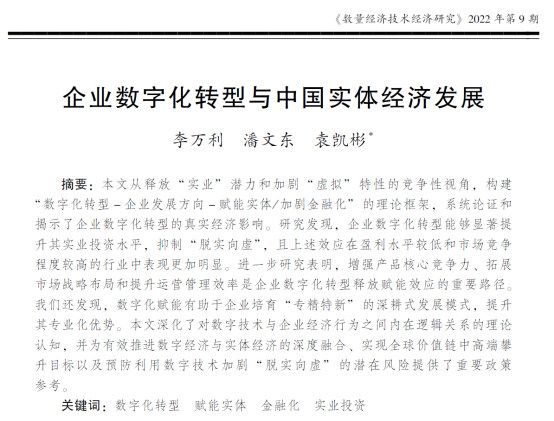 近日,海角 应用金融系李万利助理教授合作的题为“企业数字化转型与中国实体经济发展”的论文发表在《数量经济技术经济研究》2022年第9期。