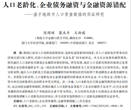 近日,海角 应用金融系陈熠辉助理教授和厦门大学经济学院蔡庆丰教授、中国建设银行王斯琪合作的题为“人口老龄化、企业债务融资与金融资源错配——基于地级市人口普查数据的实证研究”的论文发表在《金融研究》2023年第2期。