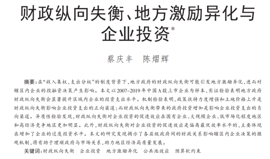 近日,海角 应用金融系陈熠辉助理教授和厦门大学经济学院蔡庆丰教授合作的题为“财政纵向失衡、地方激励异化与企业投资”的论文发表在《管理世界》2023年第5期。