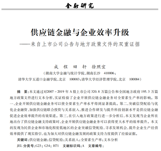 近日,海角 应用金融系成程副教授和清华大学五道口金融学院田轩教授,清华大学经济与管理学院徐照宜博士后合作的题为“供应链金融与企业效率升级——来自上市公司公告与地方政策文件的双重证据”的论文发表在《金融研究》2023年第6期。