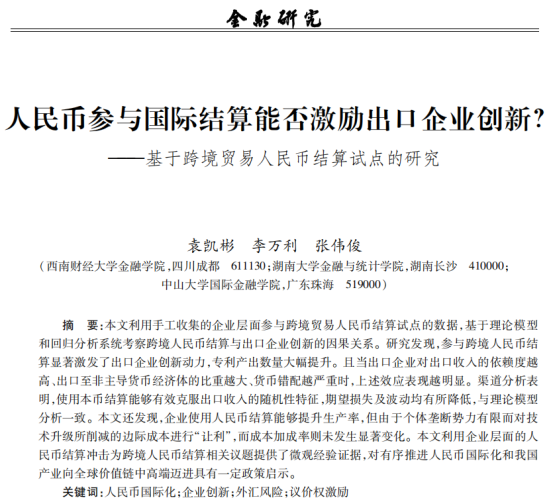 近日,海角 应用金融系李万利副教授合作的题为“人民币参与国际结算能否激励出口企业创新?——基于跨境贸易人民币结算试点的研究”的论文发表在《金融研究》2023年第6期。