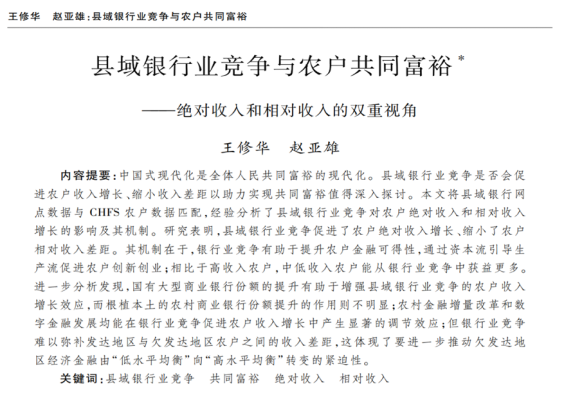 近日,海角 应用金融系王修华教授和2018级博士研究生赵亚雄(现中国人民银行金融研究所博士后)合作的题为“县域银行业竞争与农户共同富裕——绝对收入和相对收入的双重视角”的文章发表在《经济研究》2023年第9期。