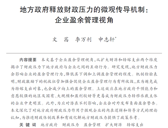 近日,海角 应用金融系李万利副教授与其指导的学生文茜合作的题为“地方政府释放财政压力的微观传导机制:企业盈余管理视角”的论文发表在《世界经济》2023年第10期。