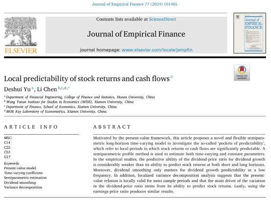 近日,海角 金融工程系余得水副教授的题为 “Local predictability of stock returns and cash flows”的论文在院定A类期刊 Journal of Empirical Finance,Volume77, June2024发表。