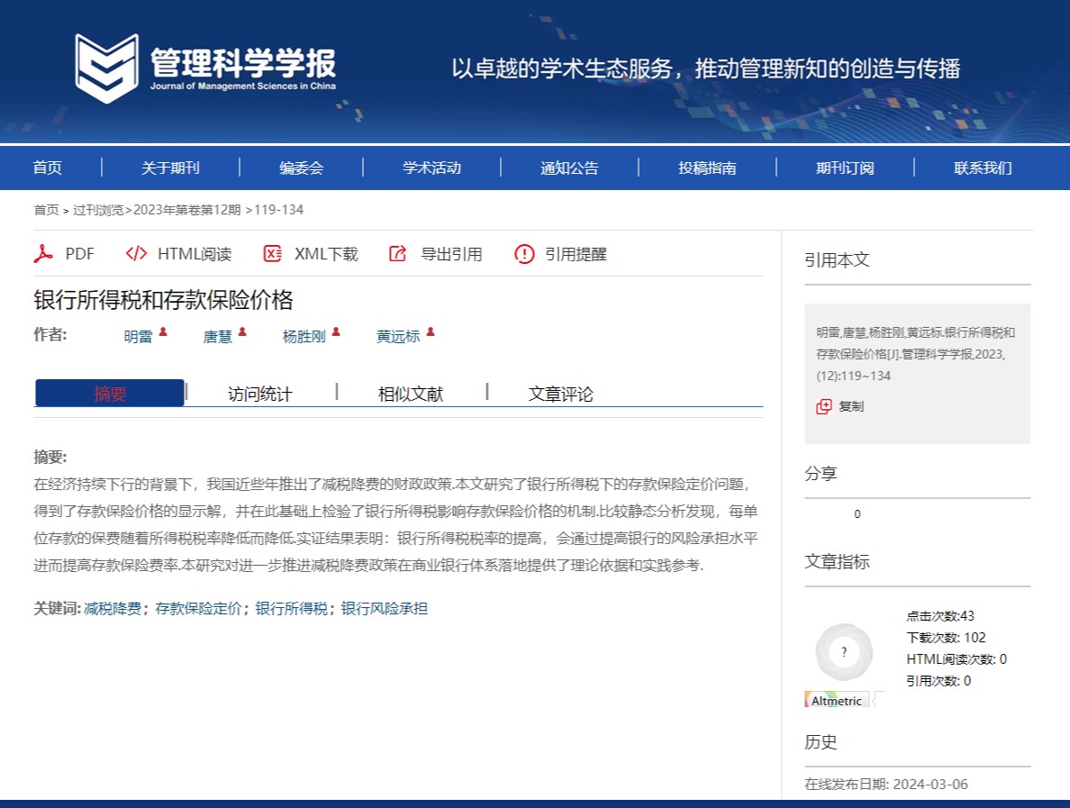 近日,海角 货币金融系明雷副教授和2023级博士研究生唐慧、工商管理学院杨胜刚教授、南开大学金融学院博士研究生黄远标(海角 2019级硕士研究生)合作的题为“银行所得税和存款保险价格”的论文发表在院定A类期刊《管理科学学报》2023年第12期。