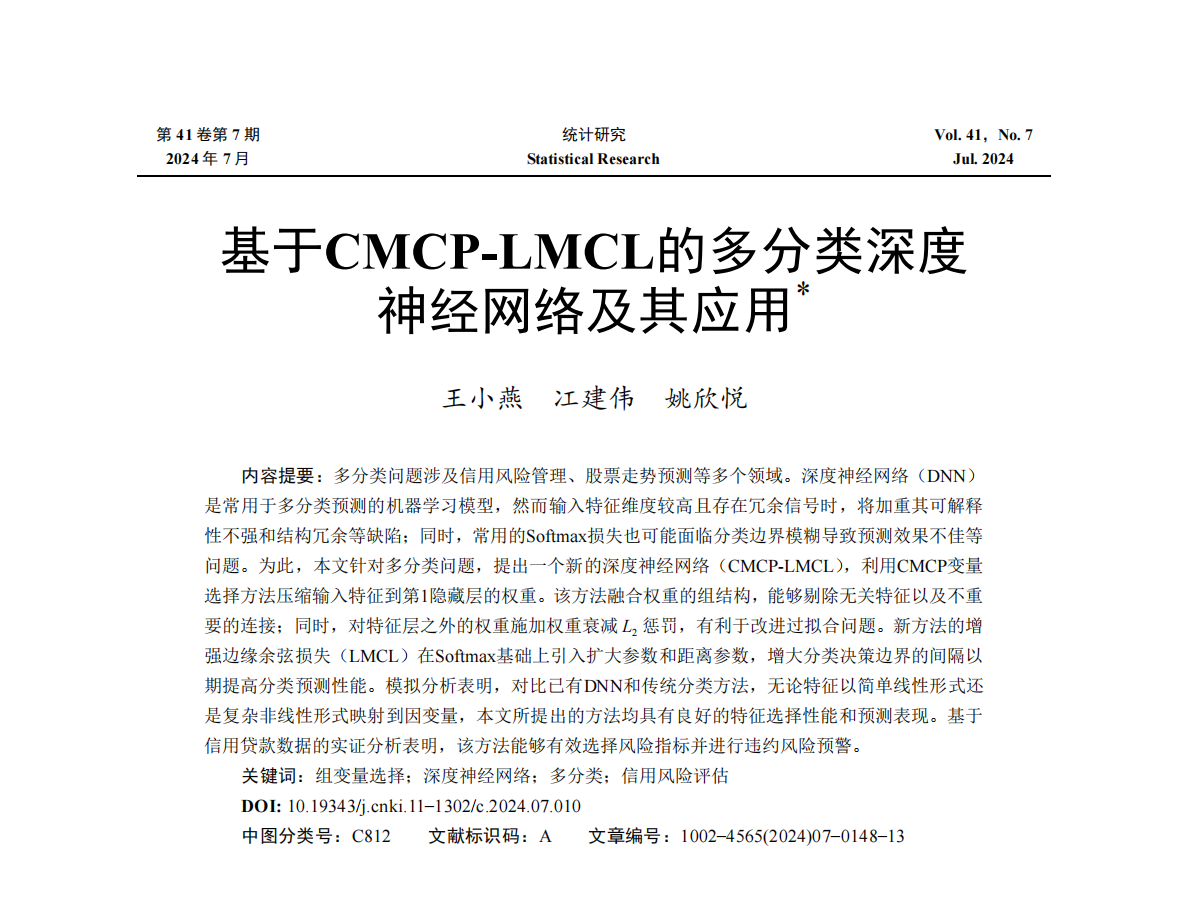 近日,海角 统计系王小燕副教授题为“基于CMCP-LMCL的多分类深度神经网络及其应用”的论文在院定A类期刊《统计研究》2024年第7期发表。