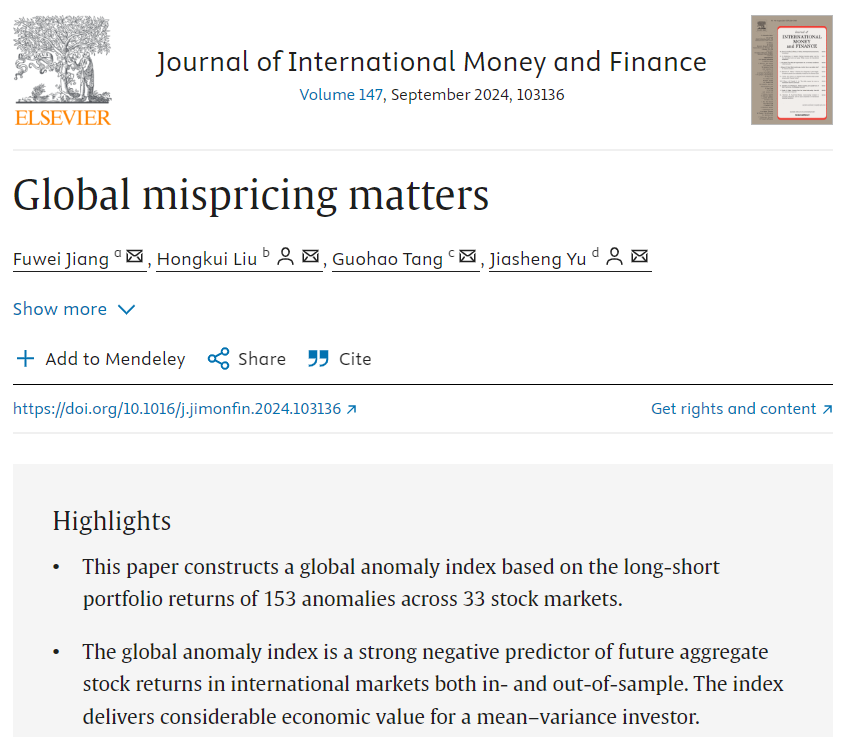 近日,海角 金融工程系唐国豪副教授合作的题为“Global mispricing matters”的论文在院定A类期刊 Journal of International Money and Finance,volume 147, September 2024发表。