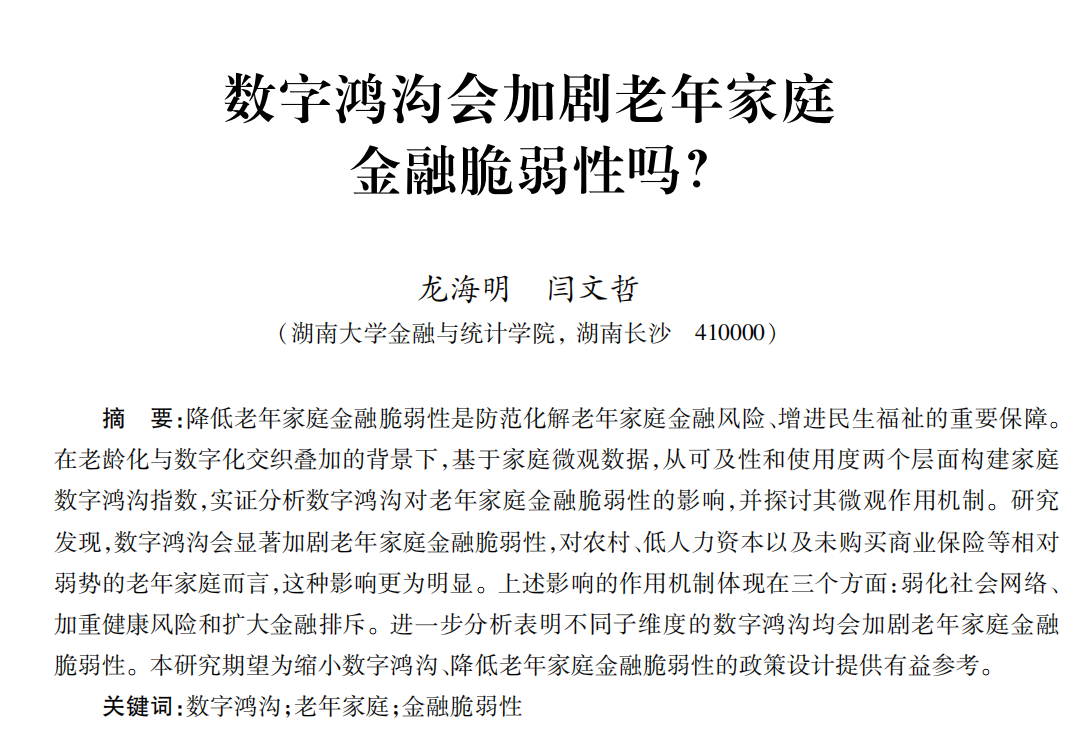 近日,海角 应用金融系龙海明教授和2021级博士研究生闫文哲合作的题为“数字鸿沟会加剧老年家庭金融脆弱性吗?”的论文发表在《金融研究》2024年第11期。