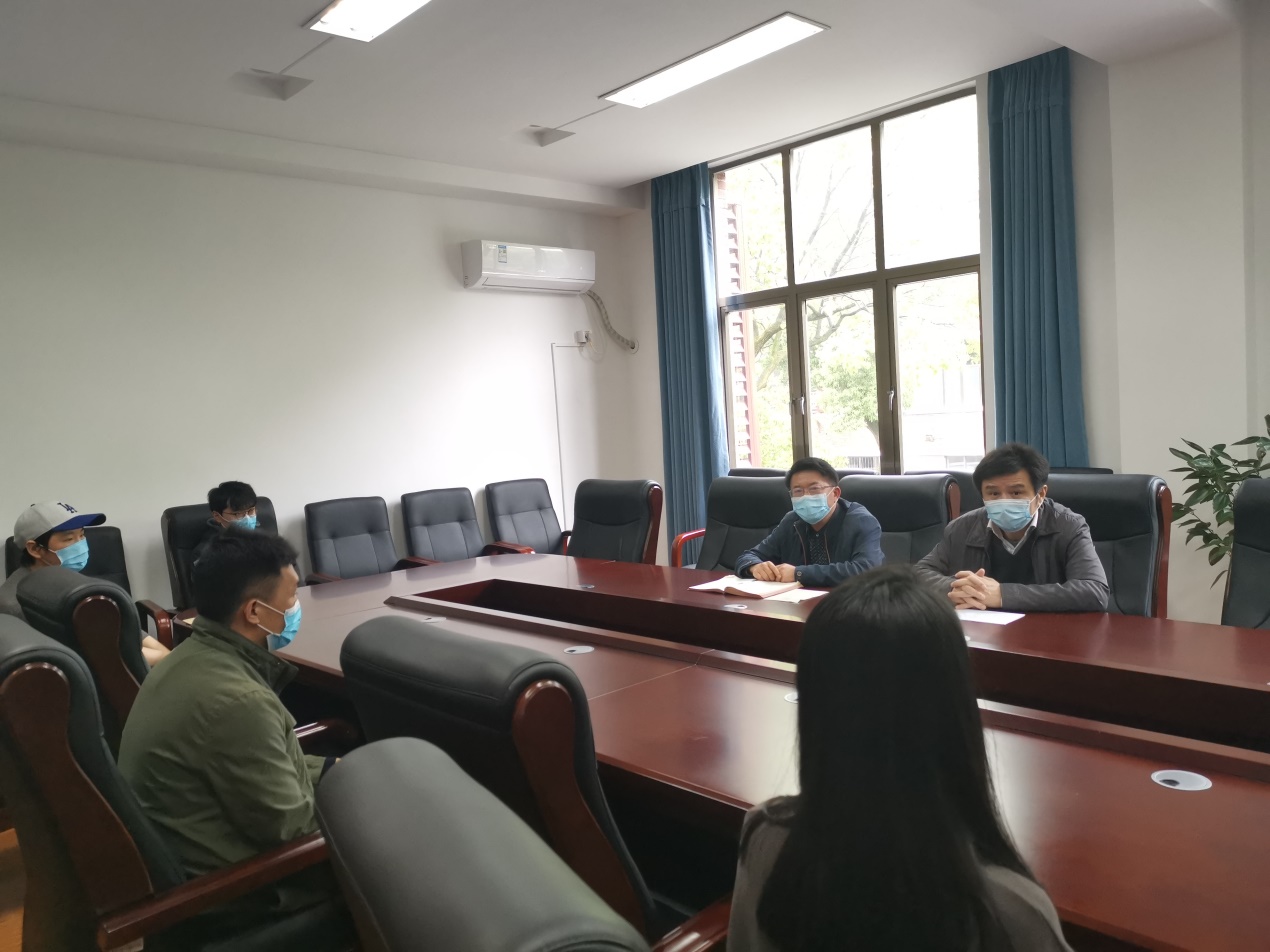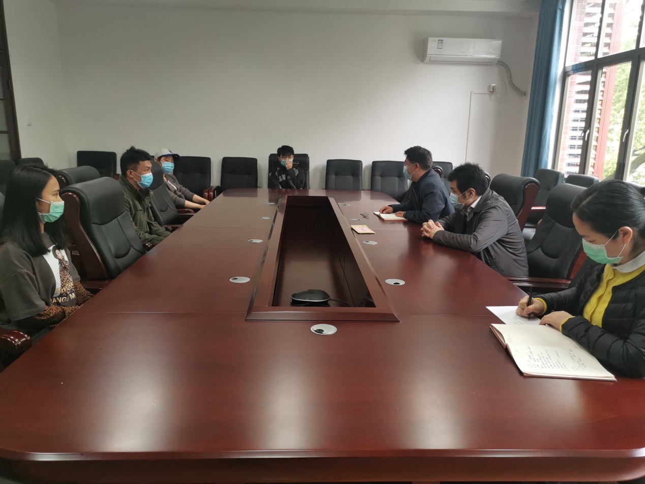4月23日,海角 召开留校本科学生座谈会,党委书记聂国军、院长潘敏、辅导员谢君、庄韫帆和四名留校学生参加会议。