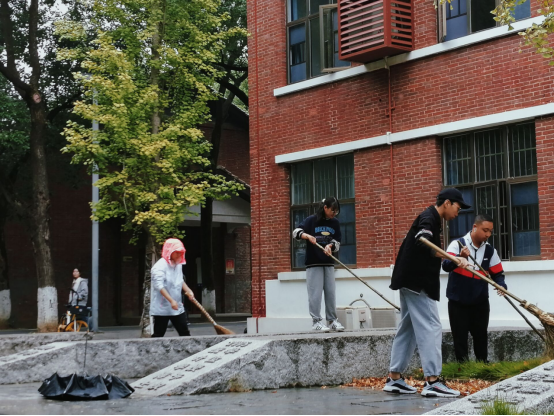 在活动的过程中,下起了霏霏细雨,但这丝毫不能影响到同学们参与清扫的热情。空调外机、屋顶、草地,同学们不放过任何一个角落,短短一个中午,院楼庭院便焕然一新。