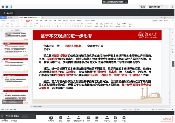 而后,戴鹏毅还基于文章观点进行了两个“纵向思考”,对文章的研究内容进行了拓展,为研究生在论文研究角度设计上提出了一些见解,向观众展示了科研观点并不仅是对前人简单总结,而是需要更深层次思考。