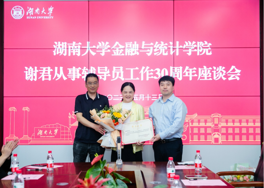 黄红立代表学院向谢君颁发荣誉证书和奖杯,校友代表李福田献花。黄红立表示,谢君老师在辅导员岗位坚守三十年是非常不容易的,她给全体辅导员老师树了榜样,立了标杆。希望广大辅导员和老师们可以向谢老师看齐,想学生之所想,用心用情关心爱护帮助学生,培养更多堪当新时代民族复兴大任的高质量人才!