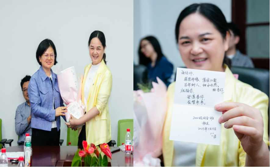 校友代表向谢君献花并送上祝福贺卡。