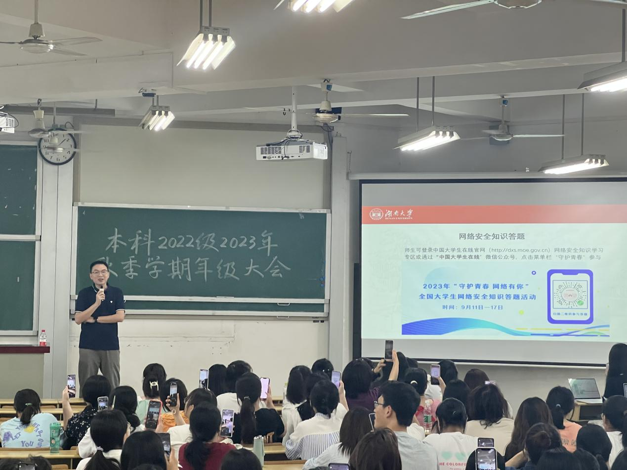 正值网络安全宣传周,为提升学生网络安全意识和技能,周斌首先带领大家观看了三则网络安全科普短片,短片以漫画的形式直观地展示了勒索病毒、数据泄露等网络安全危害,同学们扫码参与了网络安全知识答题,真切地感知到网络安全的重要性,进一步提高网络安全知识。他列举刷单诈骗、虚假网络贷款诈骗等真实案例,展现了随着互联网、人工智能、大数据等新技术飞速发展,国家网络安全形势日趋严峻,网络安全成为关乎国计民生、关乎战略全局的一件大事,向大家展示了在国家日益强大的背景下国家网络安全及个人信息安全的重要性,阐明了维护网络安全是全社会的共同责任,提醒大家在日常生活中多加辨别,注意自身财产安全及信息安全,牢记“三不一多”,遇到紧急情况及时拨打校园110。