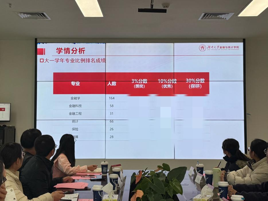 谭凤娥首先对本科2024级的整体学业表现与期中考核情况进行全面分析,特别针对高等数学、金融学等核心课程的学习成效与存在问题展开深入解读。当前学校和学院已构建多元化学业支持体系,学校层面连续两周开设期末辅学小课堂;学院持续推进“金朝与你同学” 系列分享会、“点金工作坊”,组织现场答疑与督学服务,启动“优良学风班”、“学习标兵寝室”创建工作。她强调,大二是学业夯实的关键阶段,希望同学们抛开顾虑主动寻求资源,希望班主任关注“信心不足”、“基础薄弱”、“态度不正”的学生,形成协同育人合力,切实提升人才培养质量。
