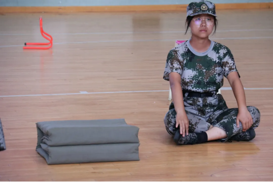 很快,同学们将被子叠成了豆腐块的形状,等待评委检查。