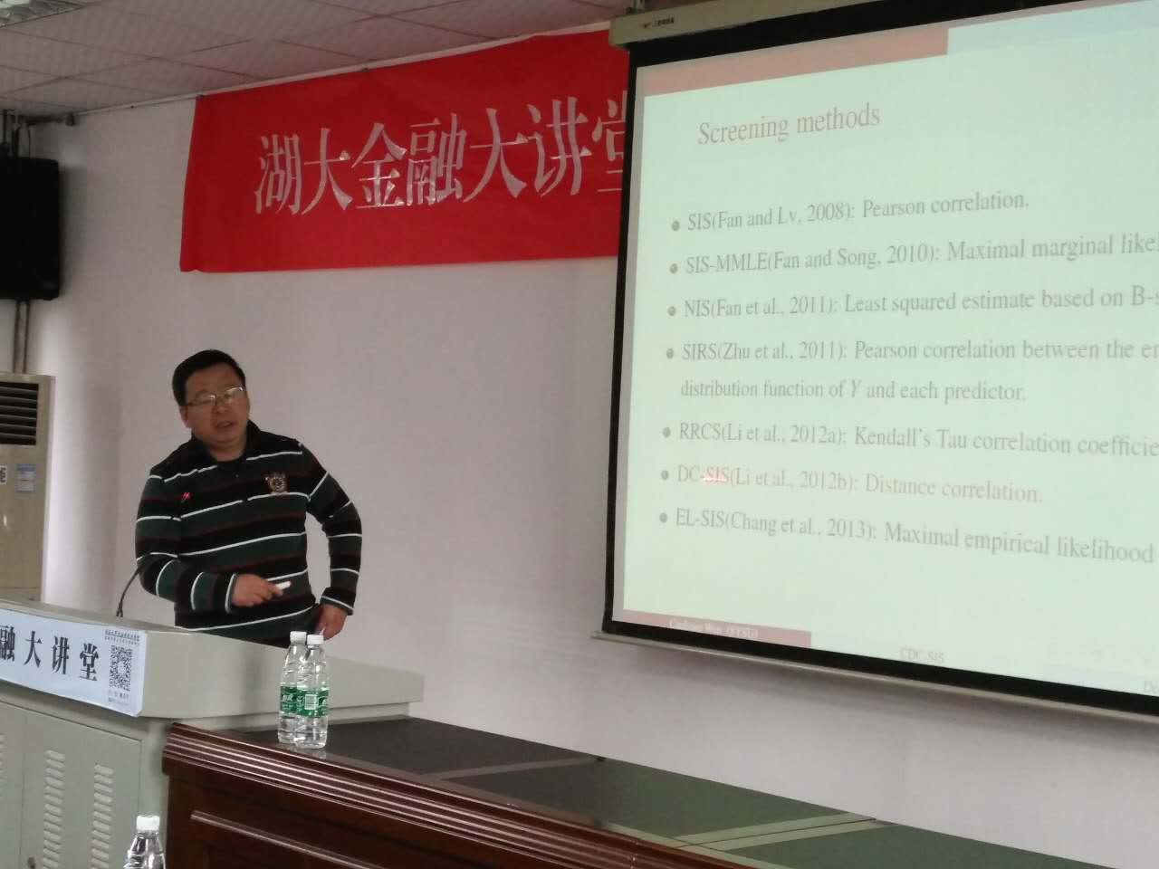 全国工业统计学教学研究会2016年会于2016年12月2日至5日在湖南长沙召开,本次会会议由海角 承办。来自全国20余所高校和研究机构的30多名专家学者参加了此次会议。会议主题是大数据与统计、高维数据处理。2016年12月2日下午,会议的四位特邀嘉宾在我校财院校区行政楼301会议室做了专题报告。中山大学数学学院王学钦教授报告题目:《SURE INDEPENDENCE SCREENING ADJUSTED FOR CONFOUNDING COVARIATES WITH ULTRAHIGH DIMENSIONAL DATA 》;武汉大学数学与统计学院刘妍岩教授报告题目:《Censored Cumulative Residual Independent Screening for Ultrahigh-Dimensional Survival Data》;广州大学经济与统计学院张崇岐教授报告题目:《Additive Mixture Designs with Heteroscedastic》;武汉大学数学与统计学院刘莉副教授报告题目:《Analysis of Missing Data in Generalized Linear Models with Random Effects》,海角 老师和研究生约60人参加了报告会,大家一致认为收获很大,是一场精彩的学术报告。