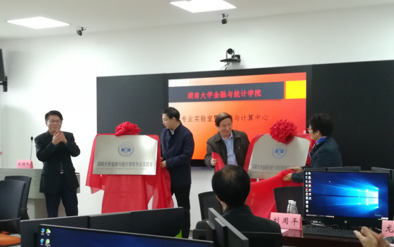 杨旭静、晏艳阳、胡宗义、聂国军分别为专业实验室和数据与计算中心揭牌,活动进入了高潮,全场报以热烈的掌声,祝贺专业实验室及数据与计算中心顺利建成。最后,全体与会嘉宾合影留念。