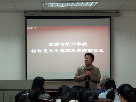 活动伊始,张琳教授上台主持,对杨智呈先生进行了简单介绍。他是国内第一批获得中国精算师资格证的成员之一,同时还是英国精算师协会正精算师,最早将英式保额分红保险引入国内市场,创立了一系列符合中国国情的保额分红产品,被誉为“中国保额分红之父”。