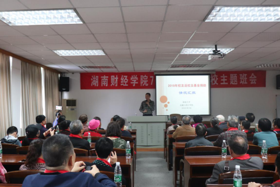 在简短的开场白后,聂国军书记首先致辞。聂书记重点向校友们介绍了财院校区现状和今后的发展规划,并说明了金统院矢志一流追求卓越的发展情况。聂书记从湖南财经学院历史讲起,它培养出了众多优秀校友,对我国当今金融行业有很大影响力。而湖南财经学院和海角 的深度融合,也会为社会输送更多人才。校友们对金统院的发展充满信心与期待,近年来学校组织了各类校友返校活动,让校友们都能感受到当年的点点滴滴。院长助理段进还对2018年校友返校及基金捐助的情况进行了汇报。