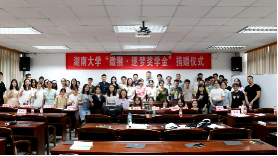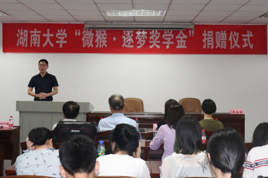 此次捐赠仪式充分展现了湖大学子对母校培育他们成才的感恩之情,表现了湖大学子不忘初心为母校做贡献的精神。“微猴·逐梦奖学金”的设立将激发同学们自主创业的热情,激励同学们多进行社会实践,在有限的大学学习时间里,勇敢逐梦,创造无限的可能!
