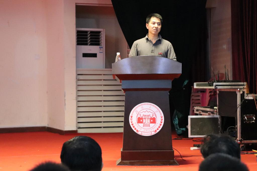 紧接着马勇老师作为教师代表发表了讲话。他从三个方面分享了自己的观点。他提出海角 优秀的师资力量有助于同学们尽情徜徉于学习天地;同学们要尽早确立个性化、多元化的目标,不应漫无目的,虚度大学时光,在不断完成小目标时能更好地激发对未来的热情与追求;他还结合名人的事例告诫学生们要形成自己正确的为人处世原则与逻辑准则。
