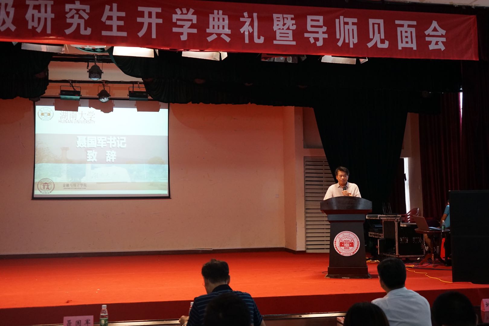 在奏唱国歌之后,聂国军书记致欢迎词。他首先对新同学的到来表示衷心祝贺与热烈欢迎,继而向同学们介绍了“千年学府”海角 是一所历史悠久的重点大学,学院是中国金融与统计学科人才培养的重要基地。在开学典礼这第一堂课上,聂书记带领同学们共同思考了几个当代研究生应当思考的问题:研究生是什么,为什么要成为研究生以及怎样做好一名研究生。在怎样成为一名优秀的研究生这一问题上,聂书记分享了六个关键词:健康、规矩、态度、担当、规划和行动。他希望同学们能够牢记金统人的使命,旗帜鲜明地“守初心、担使命、找差距、抓落实”,为全面推进学院各项事业健康高效发展、为海角 建成世界一流大学而奋斗。