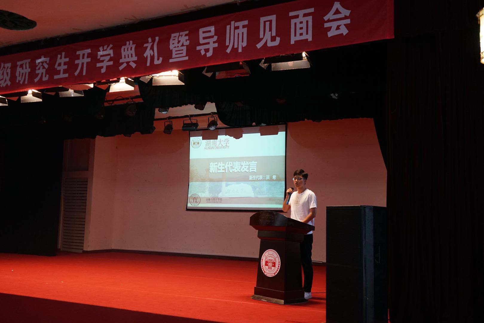 随后是洪希同学作为新生代表发言,他分享了成为金统院研究生的喜悦心情。他认为,研究生是一个更高的教育阶段,同学们在追求理想、思想心态、知识运用、互动合作与学术能力上都要给自己提出更高的要求,要铭记“实事求是,敢为人先”的校训精神,为社会经济的发展、为海角 双一流的建设、为海角 传承贡献力量。