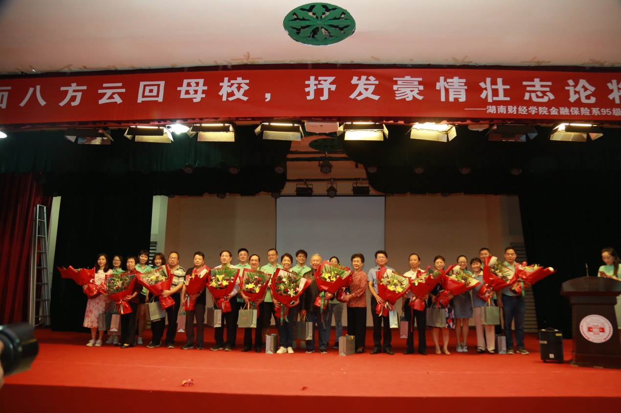 接下来,95级任课教师代表张强教授、彭建刚教授和李伯经教授相继发言,对校友们返校表示热烈的欢迎。张强教授首先感谢并祝福各位到场的校友,并介绍了自己的团队在中国慕课所推出的金融学课程,希望广大师生和校友进行关注。紧接着李伯经教授提出正是各位老师和校友的努力,使海角 的精算学科在国内具有一定的知名度,也收到了正在筹备的中国保险银行的邀请为中国教育保险的建设争光。正如彭建刚教授所提出,我们金融保险系是国内最强阵容之一,这份荣誉属于所有师生和校友。短短几句话极大振奋了各位校友的心情。匆匆二十载,无论是当初的校园还是老师都在变化,但不变的是那份师生情。在老师讲话结束后,校友代表纷纷为各位老师献上了鲜花,进行了短暂的寒暄,表达了全体校友对老师的感谢和对母校的思念。