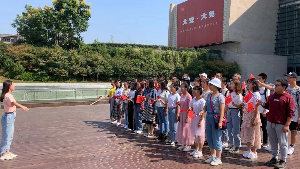 在省博物馆,保险1901班的焦林飞同学担任起临时讲解员的角色,利用排队时间向大家简单介绍湖南省博物馆的建造历史和馆藏特点。辛追墓T形帛画、马王堆一号汉墓出土的彩绘立俑、漆绘云纹匕和皿天全方罍等藏品无一不展示着汉初文化的繁荣。参观结束后,金融1903班团支部在博物馆门口唱起了《我和我的祖国》,他们手中挥舞着小红旗,在这样一个值得纪念的日子为祖国献歌。