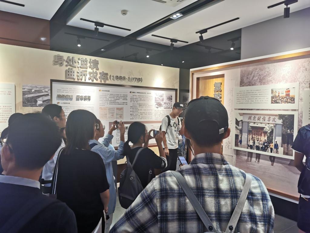 展厅分为四个部分,第一部分“奠基开拓,艰苦创业”,第二部分“身处逆境,曲折求存”,第三部分“恢复校名,重启征程” ,第四部分“风正帆悬,跨越发展”。同学们惊叹于先人奠基者惊人毅力的同时,更深刻理解了“艰难困苦,玉汝于成”的奋斗精神。在终章部分,陈列馆的墙面上展现了自湖南财经学院并入海角 以来的诸多发展成果。一个个优秀校友的故事也深入人心,保险1901班的同学在观后感中说:“给我印象最深的是汤世生学长,他在湖南财经学院毕业后自愿留校任教,继承了老师的衣钵,继续为培养优秀的湖大才子而努力。即使在弃教从商之后,他仍不忘报恩,在2009年返回湖南。我们学校似乎拥有一种与生俱来的魅力,让每个毕业学子魂牵梦萦。”