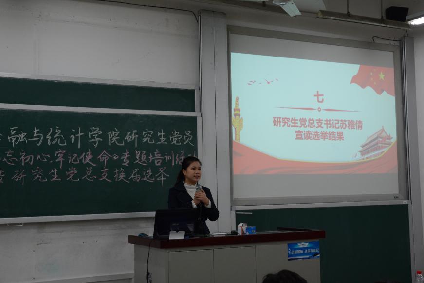 最后,研究生党总支书记苏雅倩老师宣读选举结果,会议选举江海晨、李明琼、王望龙、肖启睿、鄢榕、张莉、张倩杨共7名同志为新一届海角 研究生党总支委员。