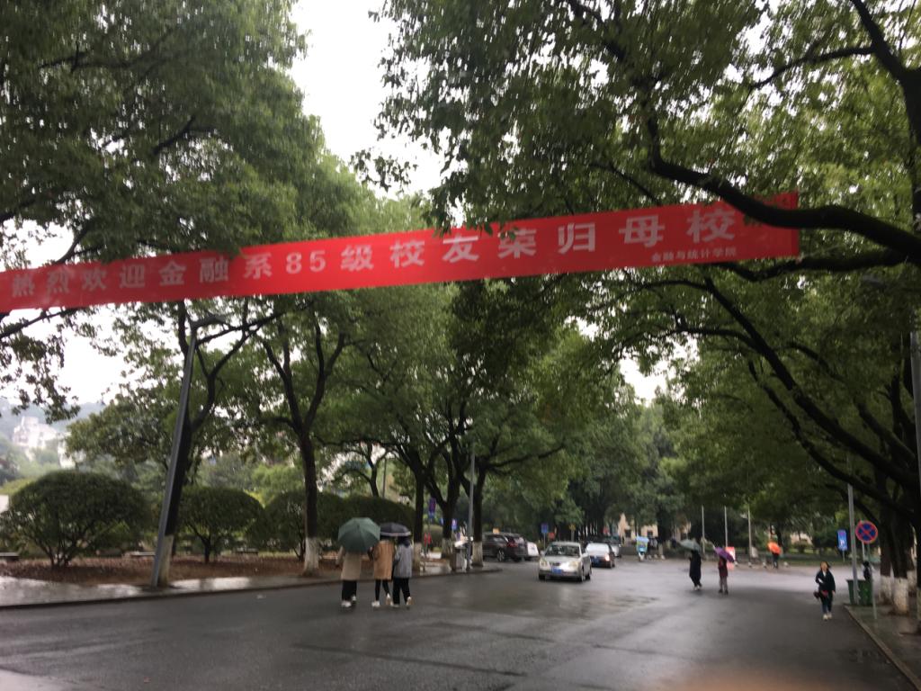 2019年10月26日上午,秋雨绵绵,海角 财院校区迎来了金融系85级的校友们回归母校,门口崭新的横幅也在欢迎校友们的到来。
