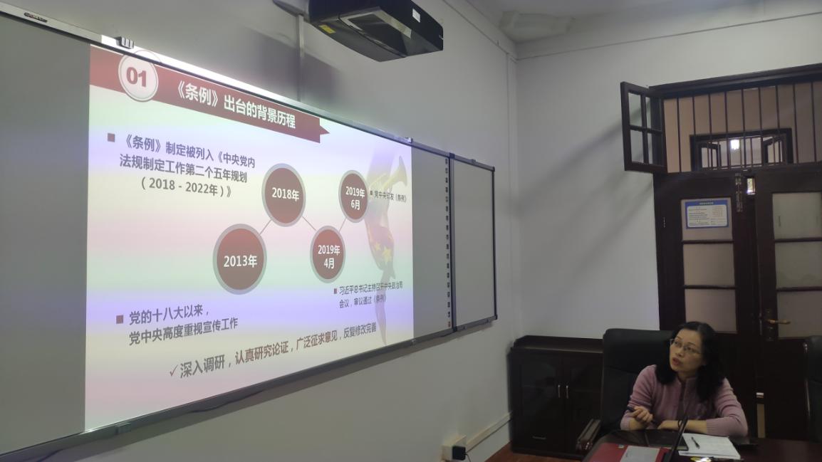 本次学习会由侯文力老师主讲,她主要对贯彻落实《中国共产党宣传工作条例》和意识形态工作进行了讲述。