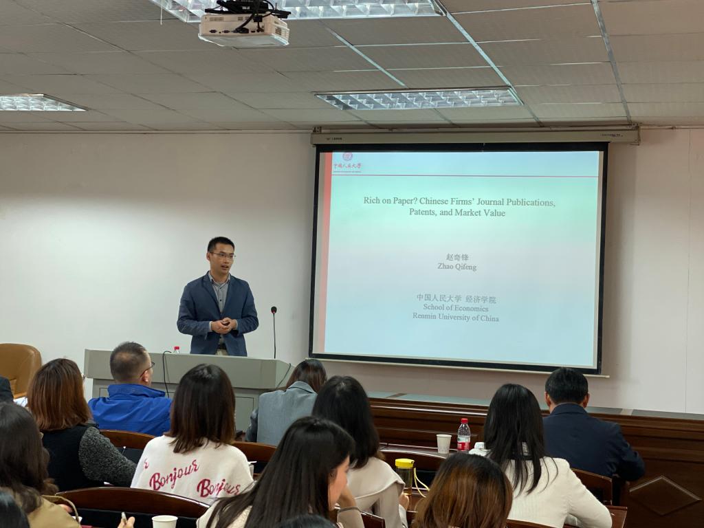 论坛进入第二阶段,由李海奇副院长主持。中国人民大学赵奇锋博士主讲《Rich on paper?Chinese firms' journal publications, patents, and market value》,该文章从当前企业发表论文的视角切入,说明企业应多增加学术研究方面的投入。论文点评人厦门大学宁博博士表示文章有用又有趣,同时提出了论文的几点可待商榷之处,与赵奇峰博士进行了深入的交流。