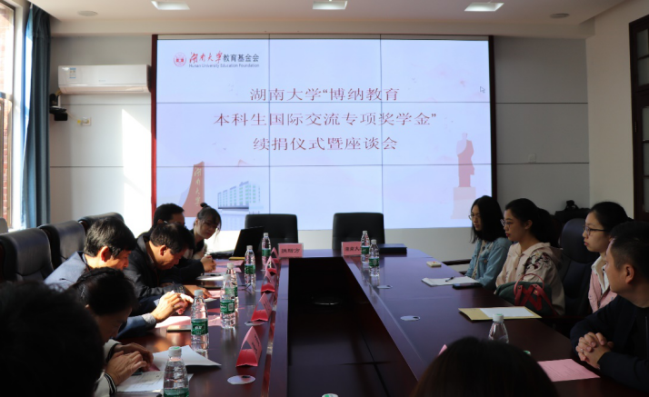 续捐仪式结束后,进入到贺志力先生与获奖学生代表的座谈会环节。首先,获奖学生代表朗读了他们共同写给贺先生的感谢信,聂国军书记也代表母校为贺志力先生送上扇子作为礼物,表达了对贺先生善良精神的感谢。接着,各位获奖学生代表依次分享了自己在国际交流的经历和收获,提出了想要和贺先生探讨问题,贺志力先生也结合自己的经验与学生代表进行耐心的交谈与回答。