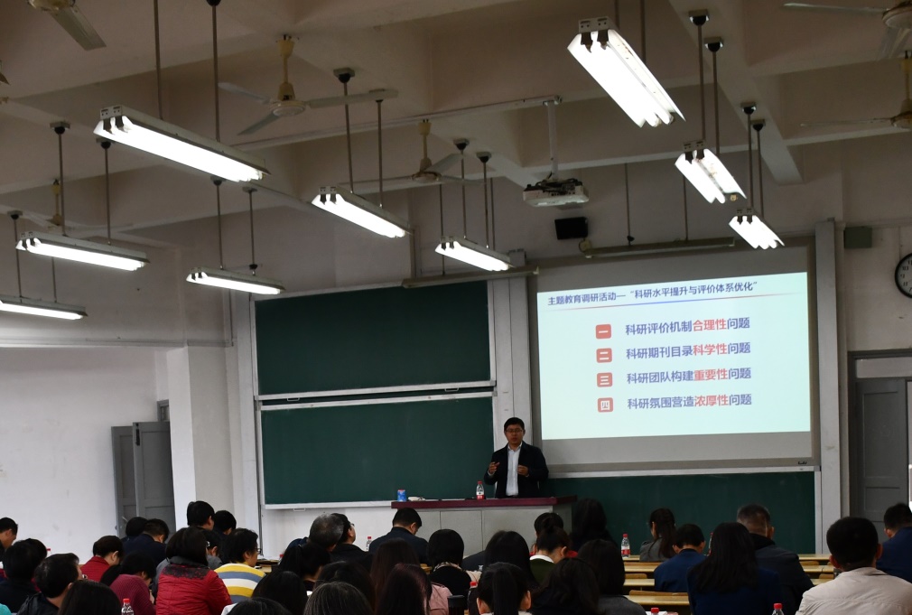 王修华副院长就前期开展的“科研水平提升与评价体系优化”主题调研活动进行了汇报与总结;对近期的科研工作安排展开部署并对“研究阐释党的十九届四中全会精神国家社科重大项目”展开动员。王修华副院长指出十九届四中全会标志着党对国家制度和国家治理体系的认识升华到一个新高度、新视野、新水平,具有里程碑意义,要求老师们高度重视本次会议精神,基于前期的研究基础,以现实问题为导向,选择相关的研究领域积极开展研究。同时学院已全面展开申报意愿摸底调查工作,要求老师们注意把握国家课题申报的时间,与学校、学院合拍共振。