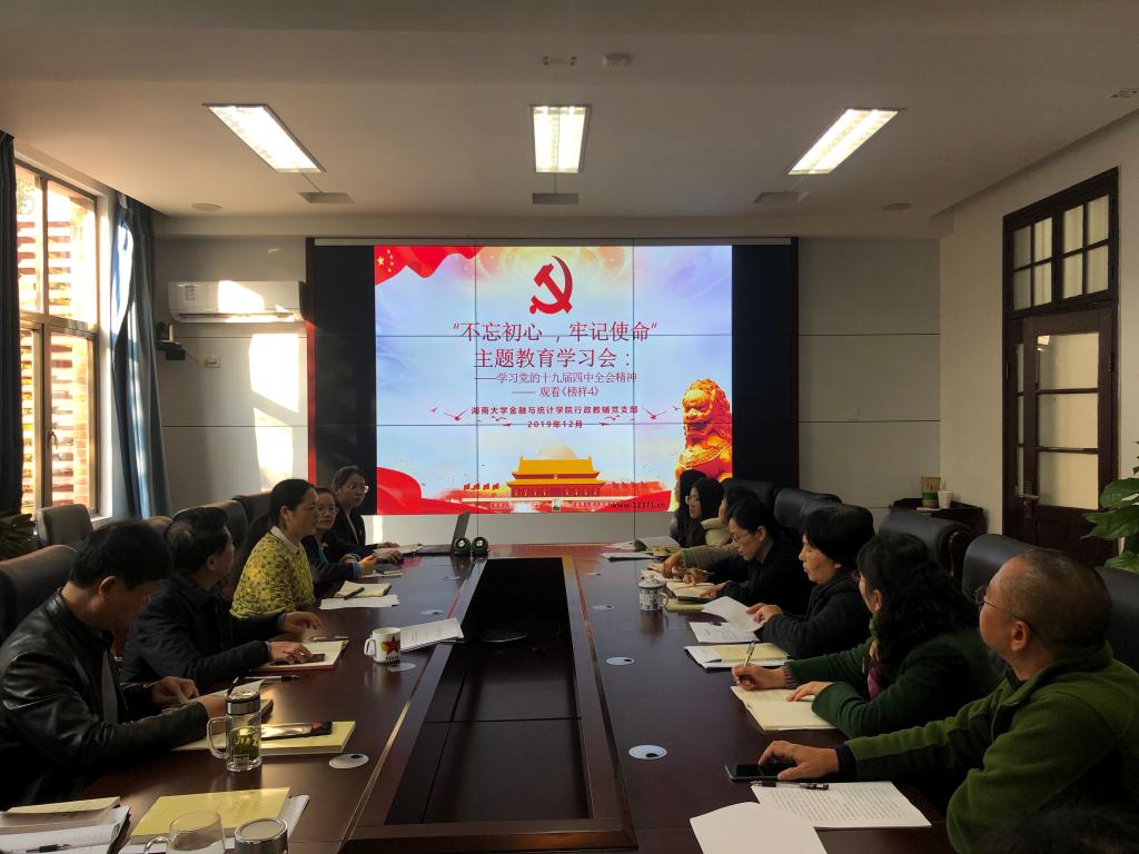 12月6日,海角 行政教辅党支部第七次“不忘初心,牢记使命”主题教育学习会在红楼226会议室召开。会议主要内容为:集中传达学习党的十九届四中全会精神和观看《榜样4》专题节目。学院党委书记聂国军、行政教辅党支部书记谢君及全体党支部成员参会。