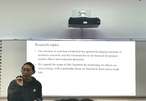 2019年12月10日星期二上午,第249期金融与统计论坛在财院校区红楼3号楼210会议室举行,本次论坛的主题是“COMMON OWNERSHIP AND ASSET PRICING, EVIDENCE FROM STOCK PRICE CRASH RISK”,主讲人是武汉大学经济与管理学院副院长李青原教授。此次讲座由海角 副院长王修华教授主持,吸引了海角 众多师生前来学习和聆听。