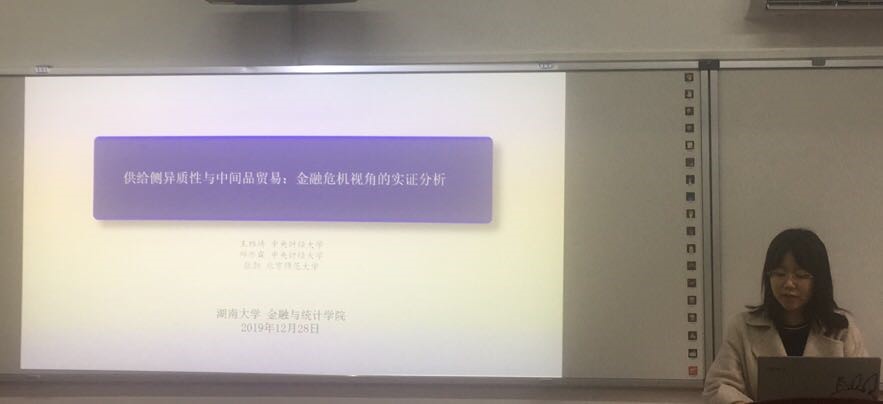 中央财经大学的邱亦霖博士就论文《供给侧异质性与中间品贸易:金融危机视角的实证分析》进行汇报,由海角 罗鹏飞助理教授进行评论。邱亦霖博士等以金融危机为切入点考察了中间产品进口对纯内销企业总产出的差异性影响,实证结果表明金融危机发生后,由于供给冲击的影响,中间品进口对纯内销企业总产出的正向作用明显减弱,结合上下游产业链分析样本期间纯内销企业上游行业产能削弱了中间品进口对于企业总产出的正向边际作用,同时增强了对企业总产出的正向作用,这在一定程度上缓解了中间品供给所带来冲击的影响。