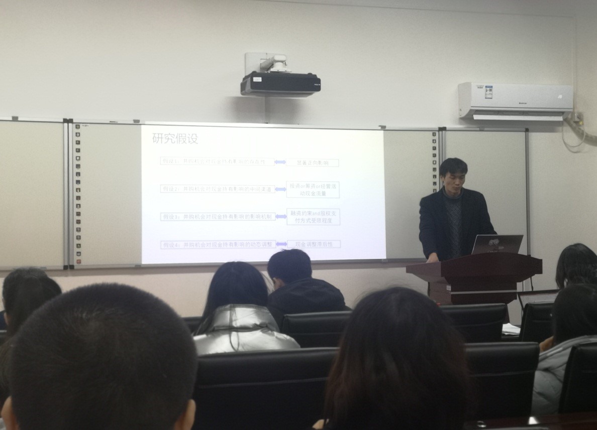中南财经政法大学的李文学博士汇报的论文题目为“并购机会影响公司现金持有吗?—基于资产重组监管放松的证据” 从几大方面讨论了企业并购机会与企业现金持有关系,提出了四个的假设关于并购机会增加时,公司现金持有的情况,并使用双重差分法验证了以上假设,得出以下的结论:并购机会增加显著使公司现金持有增加,公司主要通过减少其他投资增加现金持有,现金持有增加源于并购机会的预防需求,另外提出现金持有的增加具有时滞性。