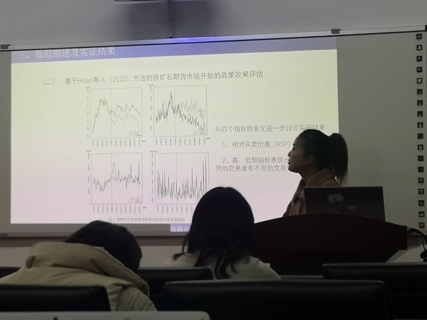 海角 王菲硕士所分享的论文主题为“金融市场的对外开放与市场质量——来自铁矿期货市场的证据”文章探究大商所铁矿石期货市场对境外投资者开放对市场质量的短期影响,进而为交易所优化监管政策,防范更多期货产品市场对外开放过程中对市场质量的负面冲击提供政策方向和理论依据。王菲同学提出文章应用Cheng Hsiao等人提出的面板数据政策评估方法,从市场紧度、市场宽度和市场深度三个方面评估铁矿石期货市场对境外投资者开放对市场质量的影响。对此篇文章,魏龙飞博士提出此研究对于我国当前加快金融业对外开放的背景,保证市场对投资者准结构变化额平稳过度和提高监管政策的有效性,具有重要的现实意义。